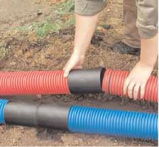 4. Стыковка труб производится посредством соединительных муфт. Для герметизации стыка используется уплотнительное кольцо. В качестве альтернативного метода стыковки можно использовать термоусадочную трубку (ТУТ). Зачастую необходимо применять заглушки для избежания попадания воды и мусора внутрь трубы.