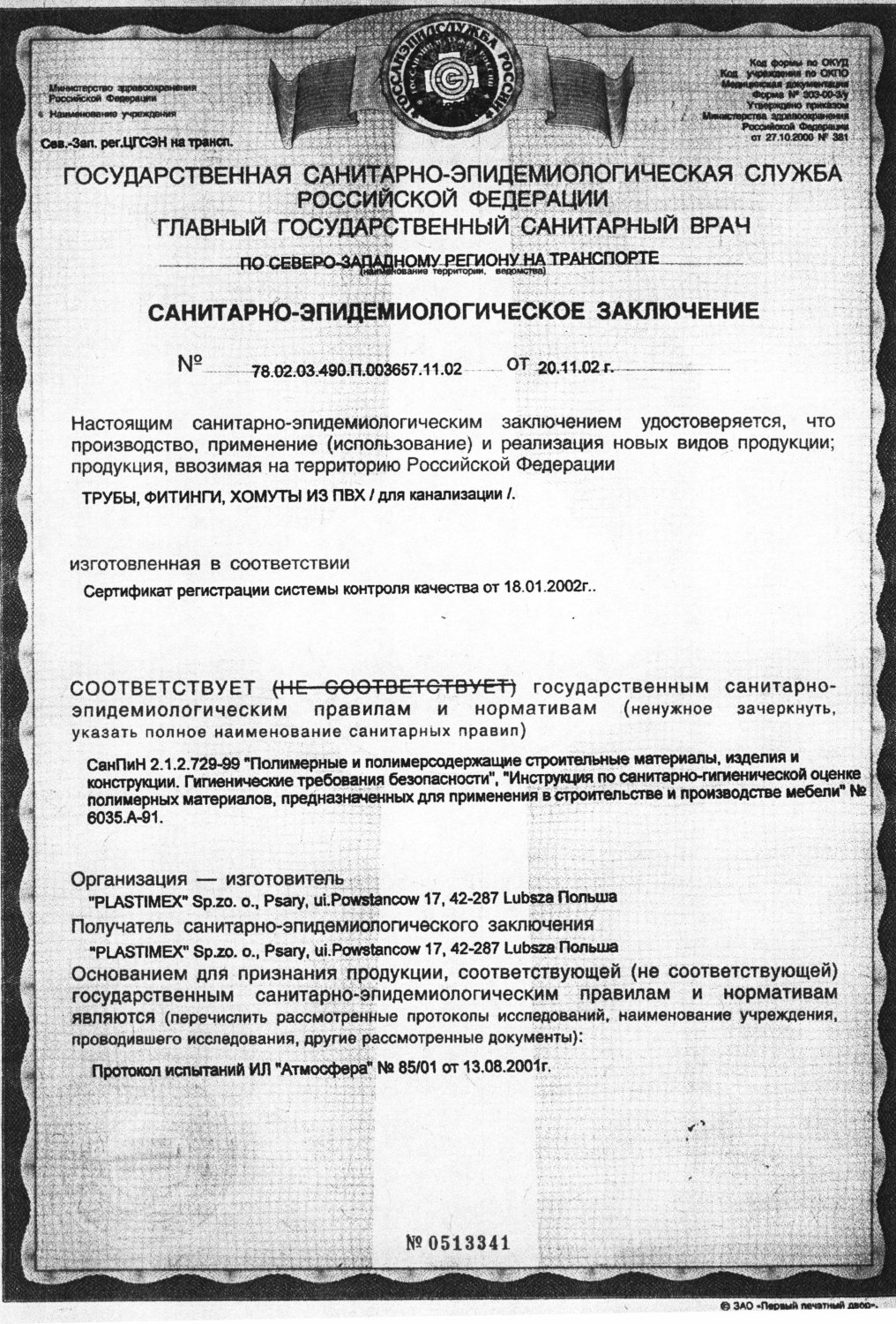 Гигиенический 2 Plastimex Санитарно-Эпидемиологическое заключение 20.11.02 31.12.12