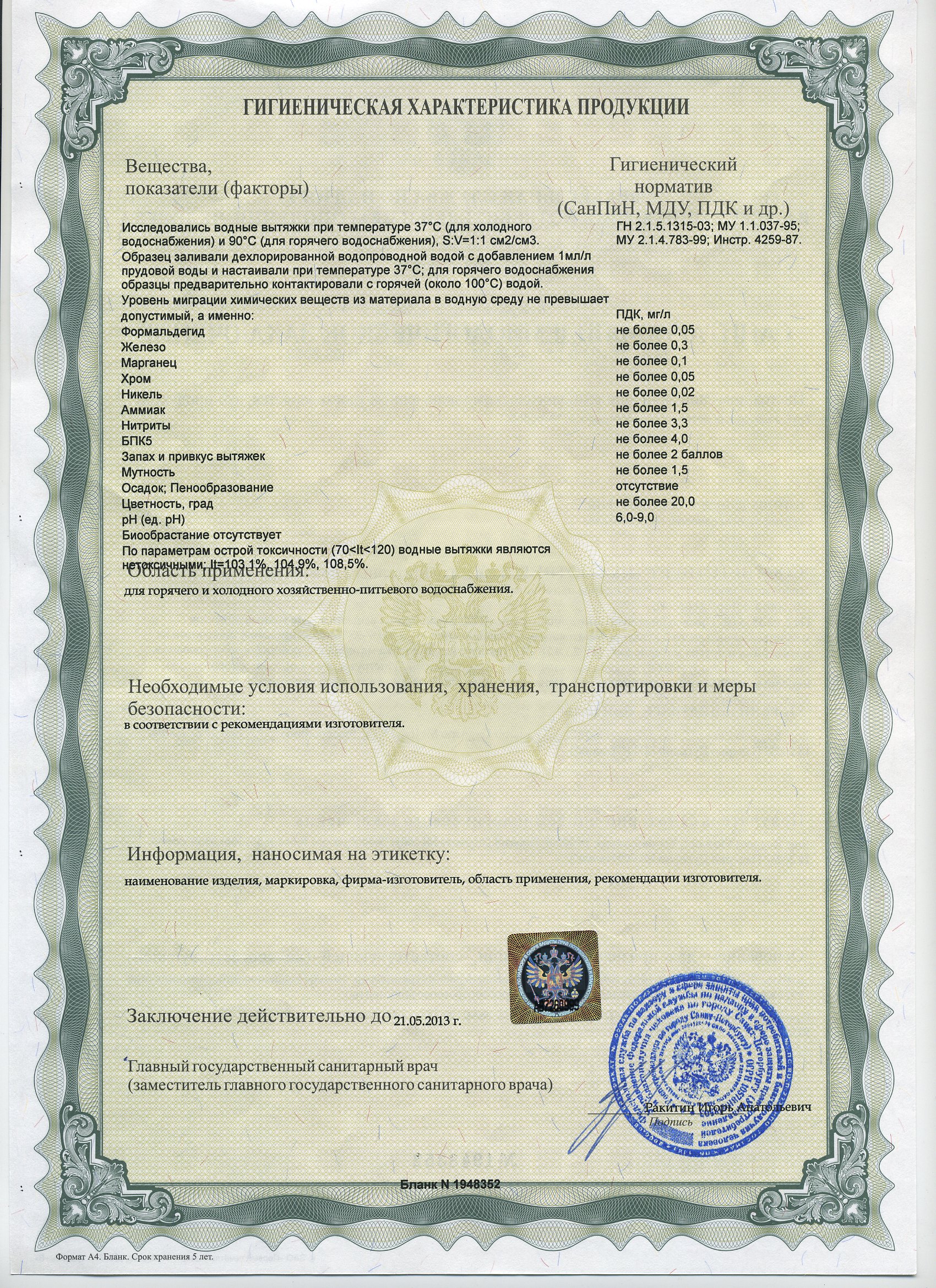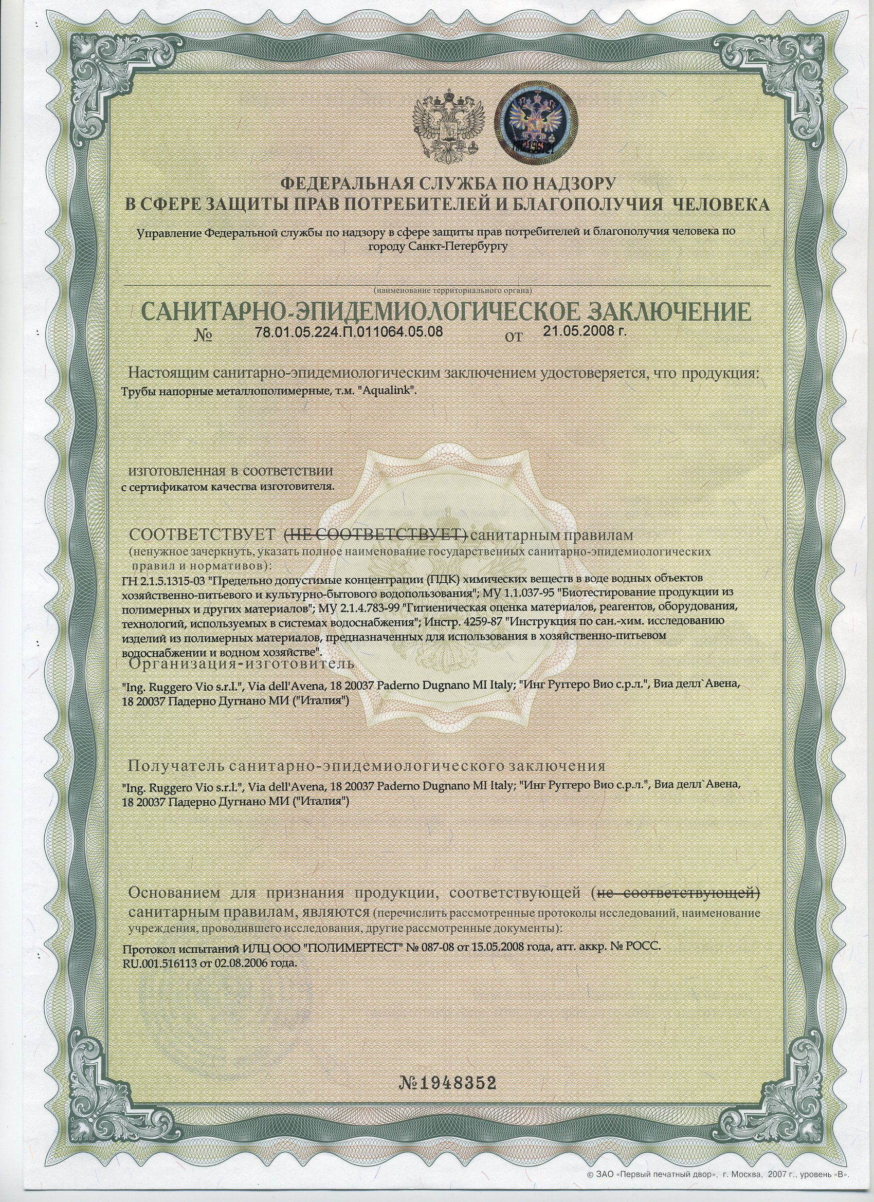 Гигиенический 2 Санитарно-Эпидемиологическое заключение AQUALINK 21.05.08 21.05.13