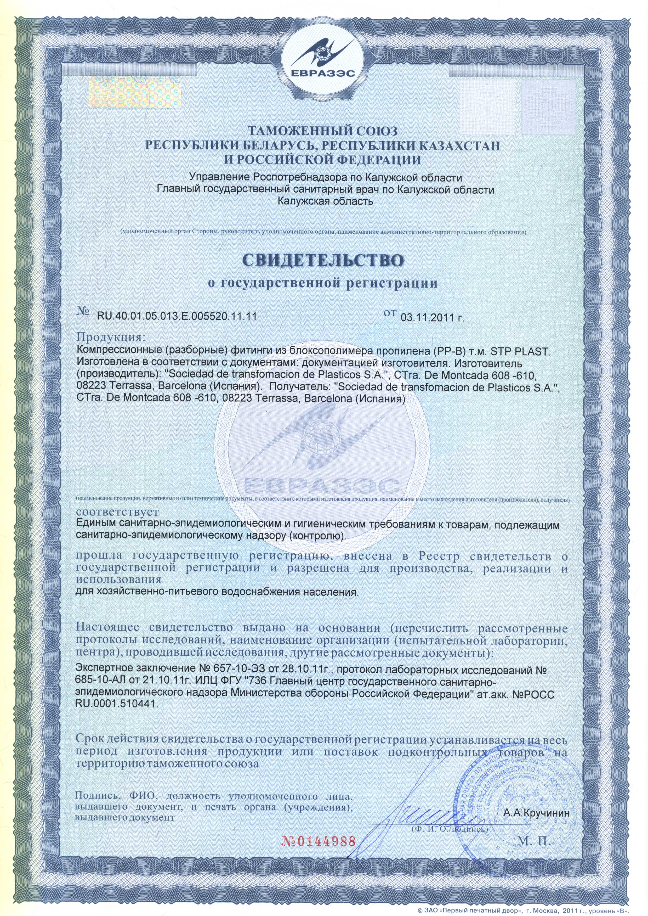 Свидетельство Свидетельство о государственной регистрации STP(Гигиена) 03.11.11