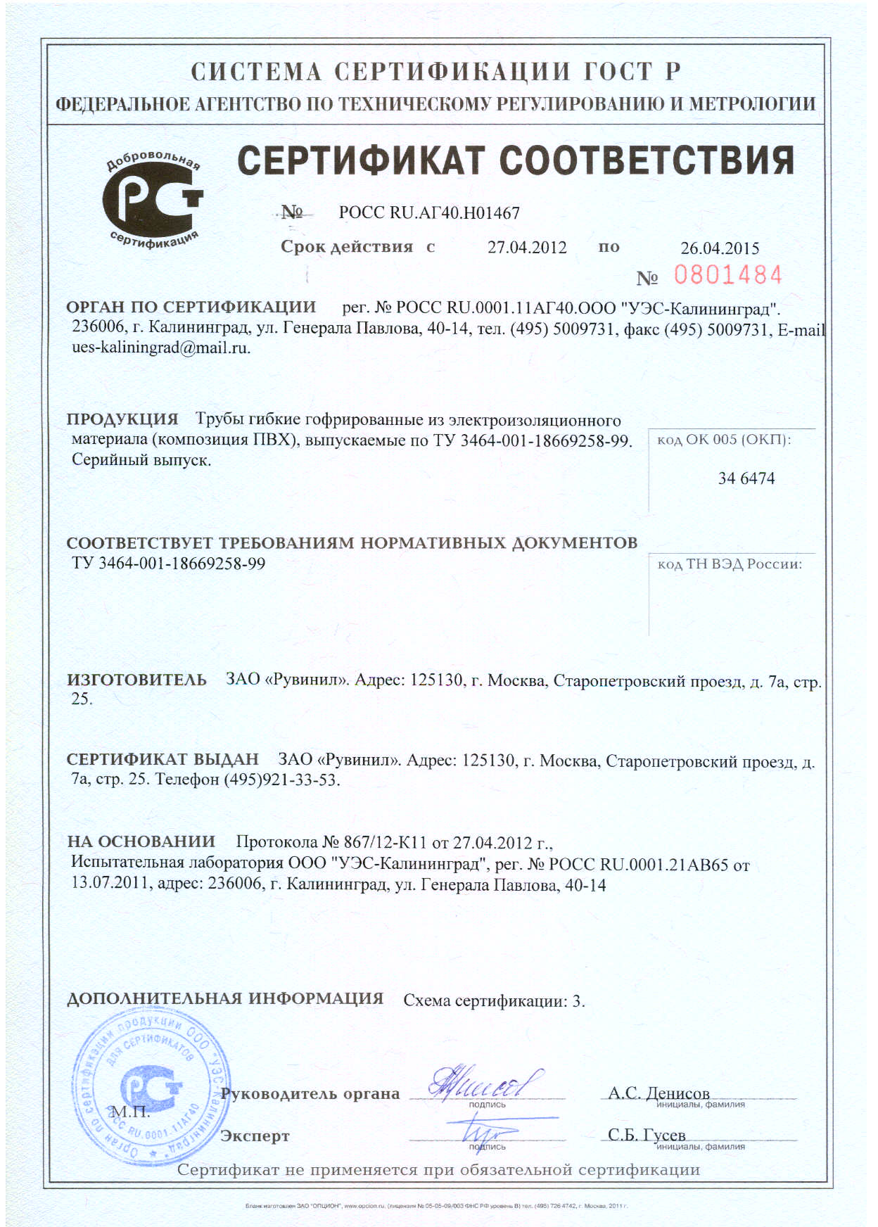 Соответствия Трубы гофрированные из ПВХ Ø16-63 Рувинил 27.04.12 26.04.15